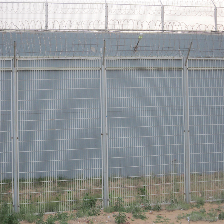 監(jiān)獄鋼網(wǎng)墻一般頂端都設(shè)有V型支架與立柱焊接。材料通常選擇和立柱同等材料或者稍小規(guī)格材料搭配使用。V型支架的加裝是為了將蛇腹形刀刺網(wǎng)固定在鋼網(wǎng)墻頂部,從而有效的增加監(jiān)獄鋼網(wǎng)墻的防攀爬性和安全性。V型支架加裝防拆卸刀刺網(wǎng)。刀刺網(wǎng)的直徑-般為
