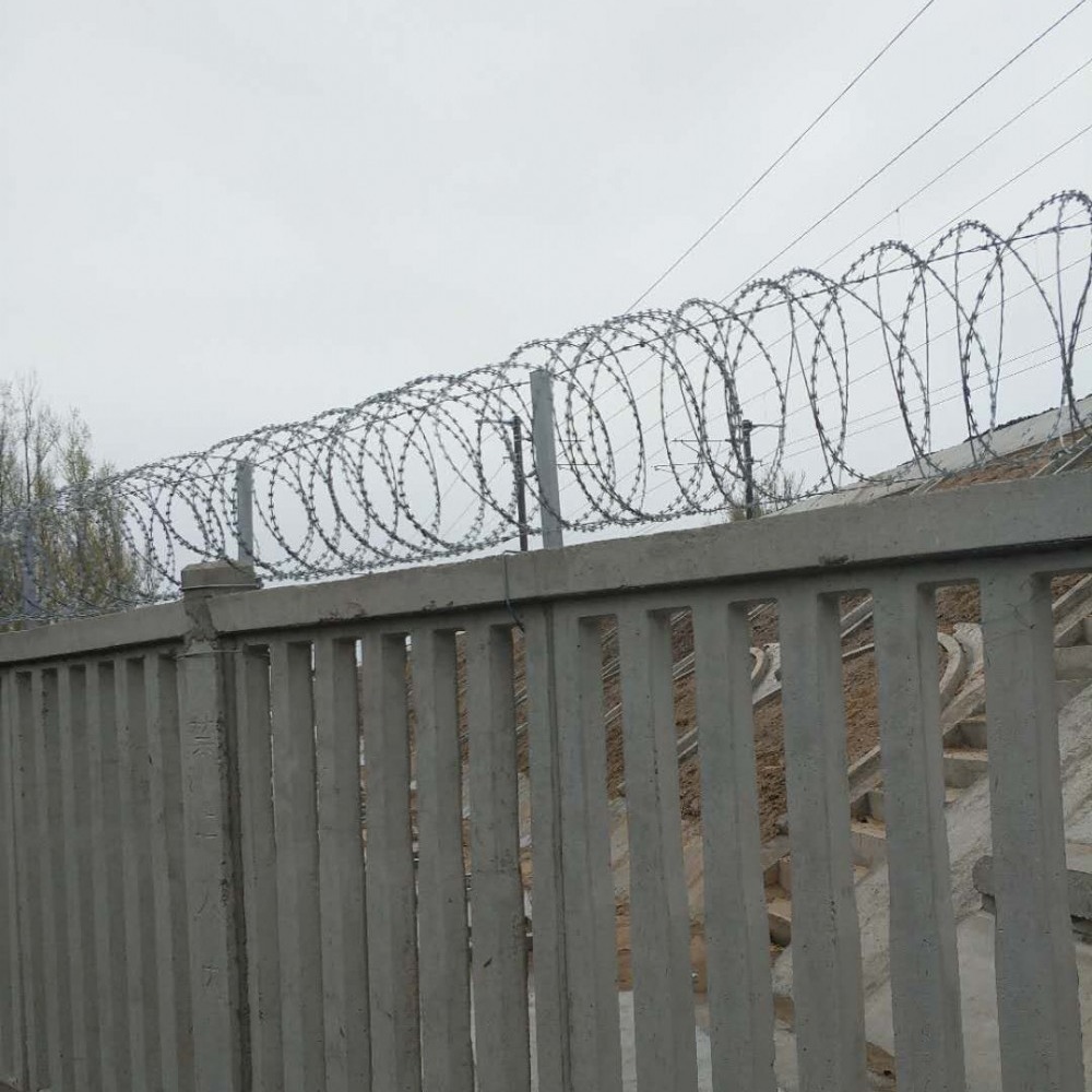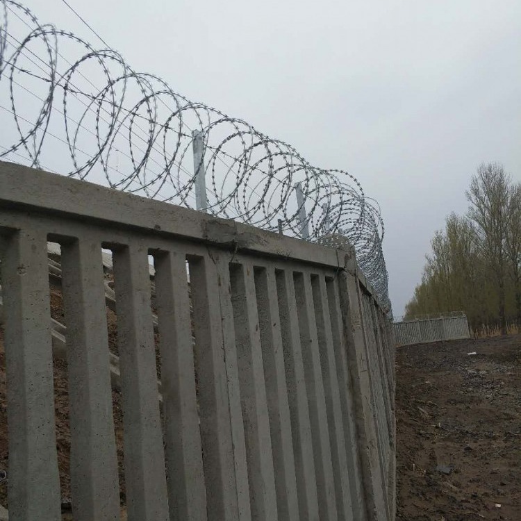 鐵路專用刺絲滾籠設(shè)置規(guī)范:鐵路專用刺絲滾籠采用刀片刺繩繞圈后相臨兩圈每隔120”用刺絲連接卡固定,張開后形成蛇腹網(wǎng)狀,閉合后刀片刺繩圈徑為500mm,張開后每交叉圈安裝間距200mm,直徑不小于450mm。鐵路專用刺絲滾籠由刺絲連接卡扣與固定在支架上的縱向拉筋相連接,縱向拉筋與支架的連接采用02.5mm的冷拔鍍鋼絲繞2圈擰緊固定。鐵路專用刺絲滾籠刀片刺繩由沖切鋼板采用機(jī)械壓軋?jiān)阡摻z上成型,刀刺寬度22mm,兩刃垂直間距15mm,刀刺縱向間距34m,芯絲直徑為2.5mm。刀片采用厚度0.5mm。